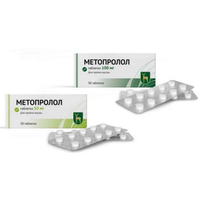 Метопролол 50мг; Вспомогательные в-ва: лактозы моногидрат, крахмал картофельный, повидон, магния стеарат, карбоксиметилкрахмал натрия, тальк