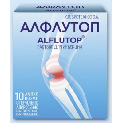 Алфлутоп — хондропротектор, активным компонентом которого является биоактивный концентрат из мелкой морской рыбы. Концентрат содержит мукополисахариды ( хондроитин сульфат ), аминокислоты, пептиды, ионы натрия, калия, кальция, магния, железа, меди ицинка. Алфлутоп предотвращает разрушение макромолекулярных структур нормальных тканей, стимулирует процессы восстановления в интерстициальной ткани и ткани суставного хряща, что объясняет его обезболивающее действие. Противовоспалительное действие ирегенерация тканей основаны на угнетении активности гиалуронидазы и нормализации биосинтеза гиалуроновой кислоты. Оба эти эффекта синергичны и обусловливают активацию восстановительных процессов в тканях (в частности, восстановление структуры хряща).