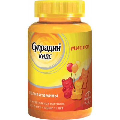 Супрадин Кидс Мишки отличается от других видов препарата своей формой в виде забавных зверушек, что делает применение пищевой добавки безболезненной и приятной для малыша. Жевательные пластинки Супрадин Кидс Мишки с приятным апельсиновым вкусом, цветом и запахом понравятся вашему ребенку.