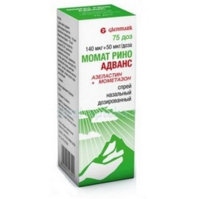 Режим дозирования. Взрослые старше 18 лет: Рекомендуемая доза составляет одно впрыскивание в каждую ноздрю два раза в сутки утром и вечером. Пациенты с нарушением функции печени: У пациентов с нарушением функции печени корректировка дозы не требуется. Способ применения. Спрей назальный дозированный с азеластина гидрохлоридом и мометазона фуроатом предназначен только для интраназального применения. Применяйте препарат только согласно тем показаниям, тому способу применения и в тех дозах, которые указаны в инструкции. Если через 14 дней лечения улучшения не наступает или симптомы усугубляются, или появляются новые симптомы, необходимо обратиться к врачу. Без консультации с врачом препарат Момат Рино Адванс не следует применять более 3 месяцев подряд. Рекомендации для пациентов по применению препарата. Подготовка назального спрея к применению: Флакон следует осторожно встряхнуть перед использованием в течение примерно 5 секунд, наклоняя его вверх и вниз, а затем снять защитный колпачок. Перед первым использованием назальный спрей с азеластина гидрохлоридом и мометазона фуроатом необходимо подготовить, нажав и отпустив назальный адаптер 6 раз. Если назальный спрей с азеластина гидрохлоридом и мометазона фуроатом не использовался в течение более 7 дней, его необходимо подготовить, нажав и отпустив назальный адаптер дважды или до появления мелкой дисперсии. Применение назального спрея: 1. Снимите защитный колпачок. 2. Перед первым применением назального спрея подготовьте дозирующее устройство, нажав вниз на выступы белого назального адаптера указательным и средним пальцами, удерживая основание флакона большим пальцем. Не прокалывайте назальный адаптер. При распылении не направляйте в глаза. 3. Перед применением по возможности очистите носовые ходы. Зажмите одну ноздрю, и, слегка наклонив голову вперед, введите концевую часть назального адаптера в другую ноздрю, при этом флакон следует держать вертикально. Быстро и резко нажмите на адаптер. Не следует производить распыление на носовую перегородку. 4. Произведите выдох через рот. 5. Повторите действия, описанные в пункте 3 для другой ноздри. 6. Протрите назальный адаптер чистой салфеткой и наденьте защитный колпачок.